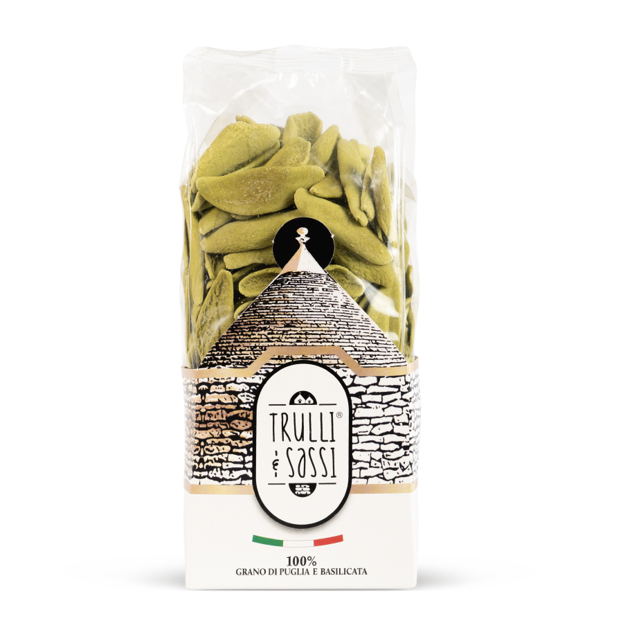 Una forma che richiama le foglie d’ulivo pugliesi, con il verde naturale degli spinaci e una superficie porosa che abbraccia il condimento.